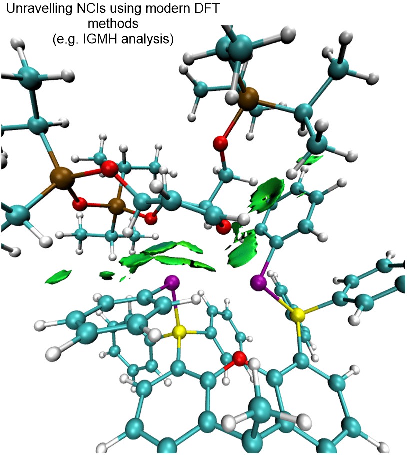 We have currently also established an in-house platform for modern DFT calculations, and we harness a range of frontier computational tools to provide theoretical support for mechanistic questions that involves NCIs. We employ state-of-the-art DFT functionals, basis sets, solvation models and thermostatical analysis tools to achieve modeling accuracy and robustness.