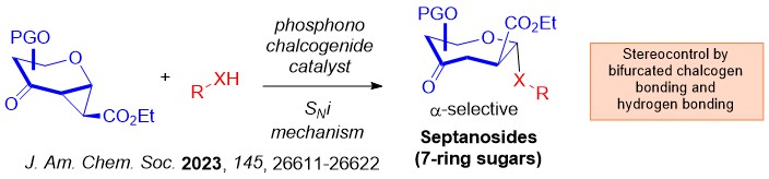 We advanced the field by introducing the robust chalcogen bonding catalyzed glycosylation in 2023. Benefiting from the 2 σ-hole per chalcogen atom on phosphonochalcogenide (PCH) catalysis, we discovered a robust O- and S-septanosylation strategy that involves a SNi mechanism.